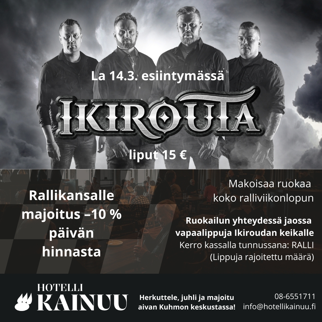 Majoitusta / Ruokailua Hotelli Kainuu Hotelli Kaleva LUE KILPAILUKUTSU! Kilpailukutsu (pdf) Kuhmo ralli ajetaan 14.3.2026 klo. 11.00 alkaen. Kilpailussa ajetaan 6 erikoiskoetta n. 77 km(ei kahteen kertaan ajettavia erikoiskokeita) koko reitin pituus on n. 220 km. Kilpailu kuuluu Pohjoisen Biohake oy talvimestaruus 2026 sarjaan ja on sen päätös kilpailu. Nuotitus perjantaina 13.3.2026 klo.9.00-18.00. Kilpailussa noudatetaan Harrastemoottoriurheilun keskusjärjestön kilpailu ja tekniikka sääntöjä, sekä Pohjoisen Biohake talvimestaruus 2026 sarjan sääntöjä Kilpailukeskus sijaitsee Kuhmo talolla Koulukatu 1 88900 Kuhmo , jossa on ilmoittautuminen ja palkintojen jako, myös sarjan palkinnot jaetaan kilpailukeskuksella. Vierisen koulun Piha-alueet toimivat huoltoalueena. Traileriparkin sijainti ilmoitetaan kilpailijatiedoteessa. Turvallisuus tarkastuksen aikataulu ja paikka ilmoitetaan kilpailijatiedotteessa.Kilpailun lähtö tapahtuu Kuhmon torilta. Huollon jälkeen (ek 3 – ek 4 välissä) Kilpailijat lähetetään uudestaan numero järjestyksessä kilpailukeskuksen edestä . Numero yhden lähtöaika ilmoitetaan kilpailija ohjeessa.Huom. Keskeyttäneiden välit tiivistetään. Kilpailija joka ei aja uusinta lähdon kautta suljetaan kilpailusta. Kilpailun ilmoittautumismaksut ovat pimeät luokat 250€ ja nuottiluokat 300€ maksu tulee suorittaa Ralli Team Kainuu ry.n tilille FI6818413000003439 8.3.2026 klo. 21.00 mennessä jolloin myös ilmoittautuminen päättyy. Kilpailuun otetaan enintään 250 kilpailijaa.Viitteenä käytä luokka numeroa ja ykkös ohjaajan nimeä Nuotitus tapahtuu perjantaina 13.3 2026 klo 9.00-18.00 Mikäli perut osallistumisesi 10.3.2026 klo 18.00 mennessä palautetaan osallistumis maksu -30€ joka jää järjestäjän kirjaamis kuluihin. Tämän jälkeen peruneille ei palauteta maksua lainkaan. Järjestä varaa oikeuden perua kilpailun , mikäli tulee ylivoimaisia esteitä kuten keli/korona yms. Tarkemmat tiedot kilpailun kulusta ja aikatauluista julkaistaan kilpailija tiedotteesa ilmoittautumisen päättymisen jälkeen rallitulokset.fi sivulla , jossa myös ilmoittautuminen kilpailuun tapahtuu. Kilpailunjohtaja Jouko Mähönen 0400 307200 jouko@kainuunautotex.fi Tervetuloa kilpailemaan Kuhmoon | |